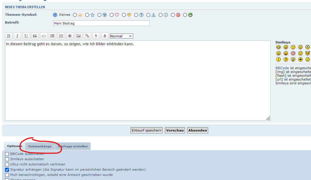 Methode 1: Hochladen von Dateien und Bildern direkt im Forum